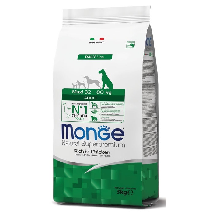 Monge Natural Superpremium Maxi Adult Ricco in Pollo è un alimento completo per cani adulti di taglia grande (32 – 80 kg).