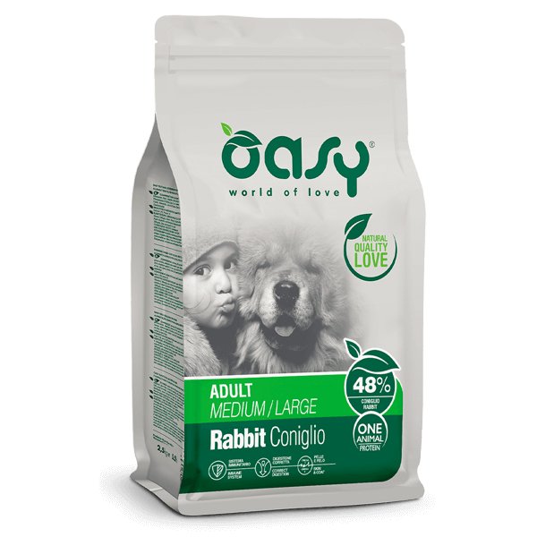 One Animal Protein Adult Medium Large Coniglio con il 48% di Coniglio, unica fonte proteica, è il cibo secco ideale per tutti cani adulti, in particolare per quelli con intolleranze alimentari, sensibilità cutanea o intestinale. Il corretto apporto di vitamine e minerali mantiene attivo e vitale il tuo cane di taglia media o grande.